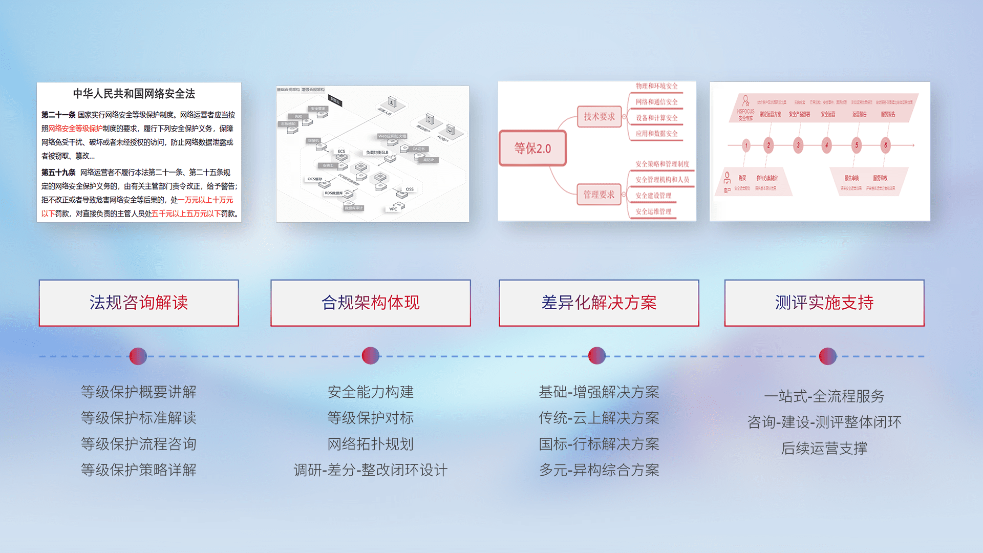 通过专业的法律咨询解读、、、、合规架构体现、、、差异化解决方案、、、测试实施支持等服务,,为客户量身打造等保合规体系。。。